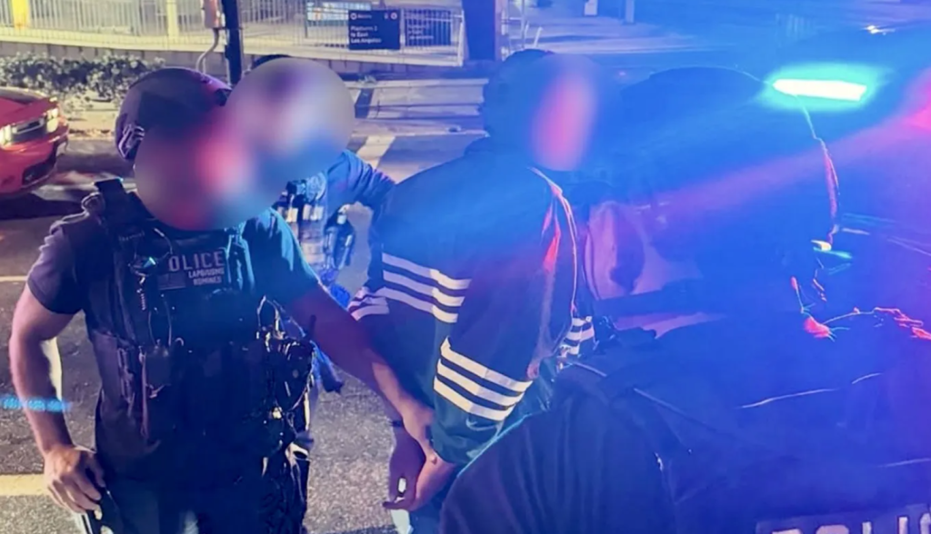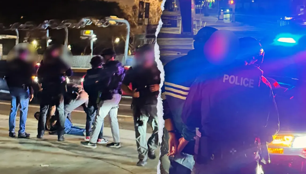 Photos released by the LAPD Narcotics and Gang Division captured the intense moment Nick Reiner was arrested. In one image, officers surround him as he is restrained. In another, he stands in handcuffs near a police cruiser.